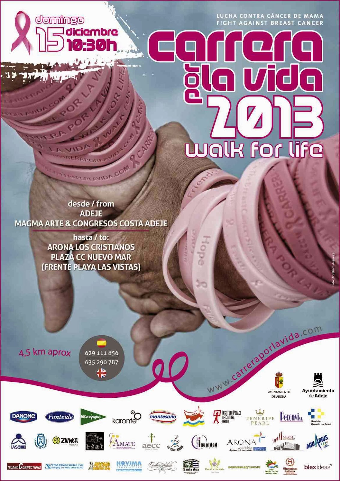 Światowy dzień walki z rakiem to 19 października. W gminie Adeje obchody Światowego dnia Walki z Rakiem Piersi zostały przeniesione na miesiąc grudzień z powodu możliwości połączenia ich z wydarzeniem Carrera por la Vida (Bieg po Życie). Carrera por la Vida to fenomen społecznej solidarności, organizowany corocznie w celu pozyskania funduszy na walkę z rakiem piersi, potwierdzając w ten sposób nasze zaangażowanie na rzecz kobiet dotkniętych tą chorobą. W roku 2012 w tym wydarzeniu wzięło udział ponad 2.300 uczestników, a zebrane środki zostały przeznaczone na pomoc dotkniętym chorobą oraz na prace badawcze. Tegoroczna edycja Carrera por la Vida odbędzie się 15 grudnia i odbywa się pod hasłem: ¨Idąc Pomagamy¨. Dlatego też Ayuntamiento Adeje wraz z Wydziałem Zdrowia, Polityki Równości oraz Turystyki zaprasza wszystkich do udziału w Carrera Por La Vida. Miejscem spotkania i rozpoczęcia Carrera por la Vida to Magma Centrum Kongresowe i Sztuki. (MAGMA ARTS & CONGRESS , Avenida Los Pueblos s / n , Costa Adeje,) o godzinie 10:30 . Stamtąd, uczestnicy wzdłuż nadbrzeża dwóch gmin, dotrą do Plaza Centro Comercial El Mar i Playa Las Vistas w Los Cristianos – gdzie znajduje się końcowy etap. W miejscu rozpoczęcia Carrera por la Vida, czyli przed Magma Centrum Kongresowe i Sztuki będzie prezentowana wystawa Cięcie Izabeli Moczarnej-Pasiek. Fotografie Izabeli Moczarnej-Pasiek to piękne i wzruszające portrety kobiet w trakcie chemioterapii, które w wyniku leczenia utraciły włosy – powszechnie postrzegane jako atrybut kobiecego piękna i witalności. Idea projektu powstała podczas pracy fotografki nad Kalendarzem Amazonek. Inspiracją było stwierdzenie, że: „strata włosów jest dla kobiet poddających się chemioterapii bardziej bolesna niż strata piersi.” Poprzez wystawę pragniemy wpłynąć na zmianę obowiązujących wzorców kulturowych i świadomości społecznej w postrzeganiu kobiet chorych na raka, przeciwdziałać wykluczeniu społecznemu. Istotnym celem jest również integracja osób chorych na nowotwory i ich rodzin. Więcej informacji na stronie organizatorów.